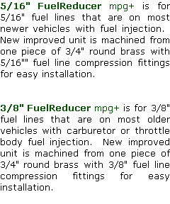 The FuelReducer will work on all cars, trucks or boats with either a 5/16" or 3/8" "metal" Fuel lines. The FuelReducer Adds 2 to 8 Miles per Gallon For a 20 gallon gas tank that means an added 40 to 160 miles per tank. Metric conversion - added 64.3737 km to 257.495 km per tank of gas